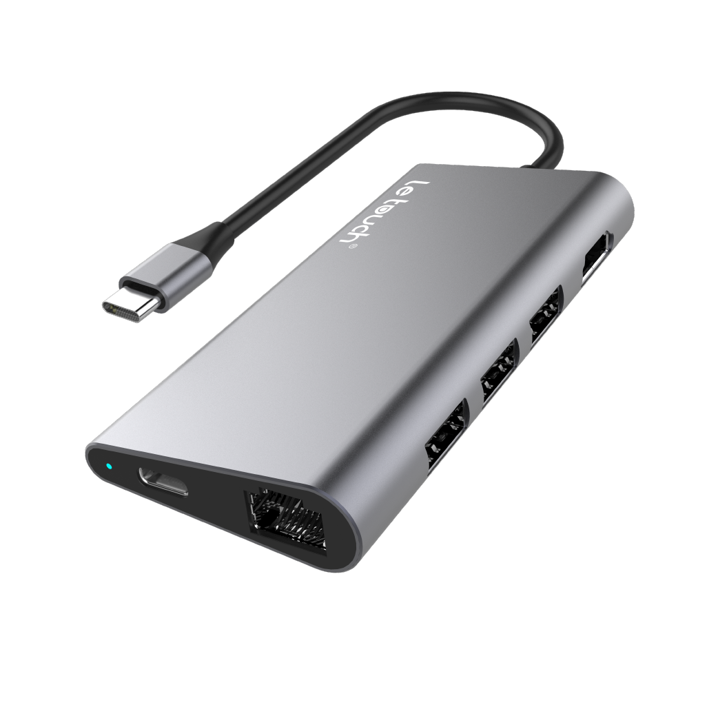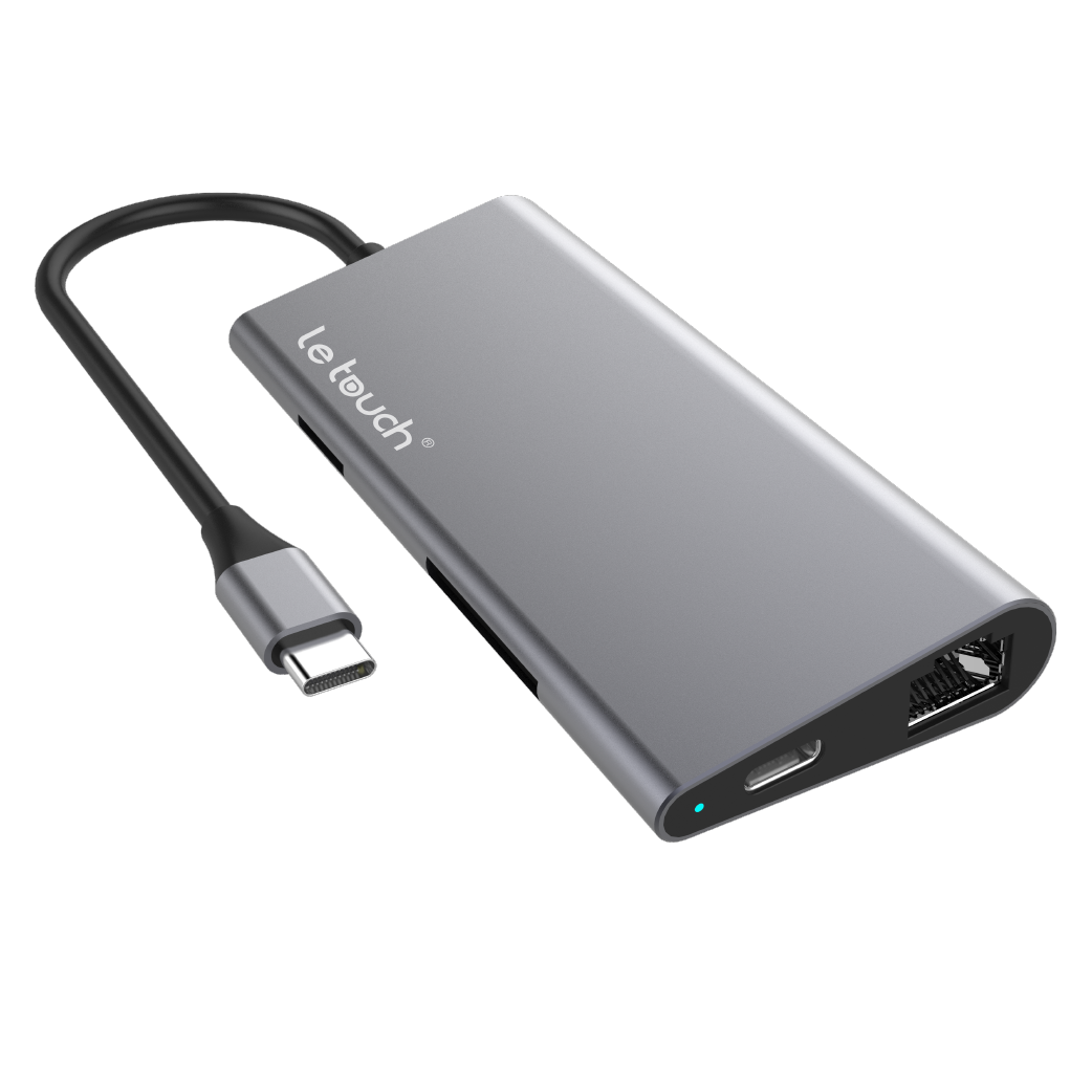 Este adaptador con acabados en aluminio pulido, cuenta con 8 puertos que permiten conectar los dispositivos que necesitas simultáneamente y sin perder la capacidad de cargar tu macbook al mismo tiempo.