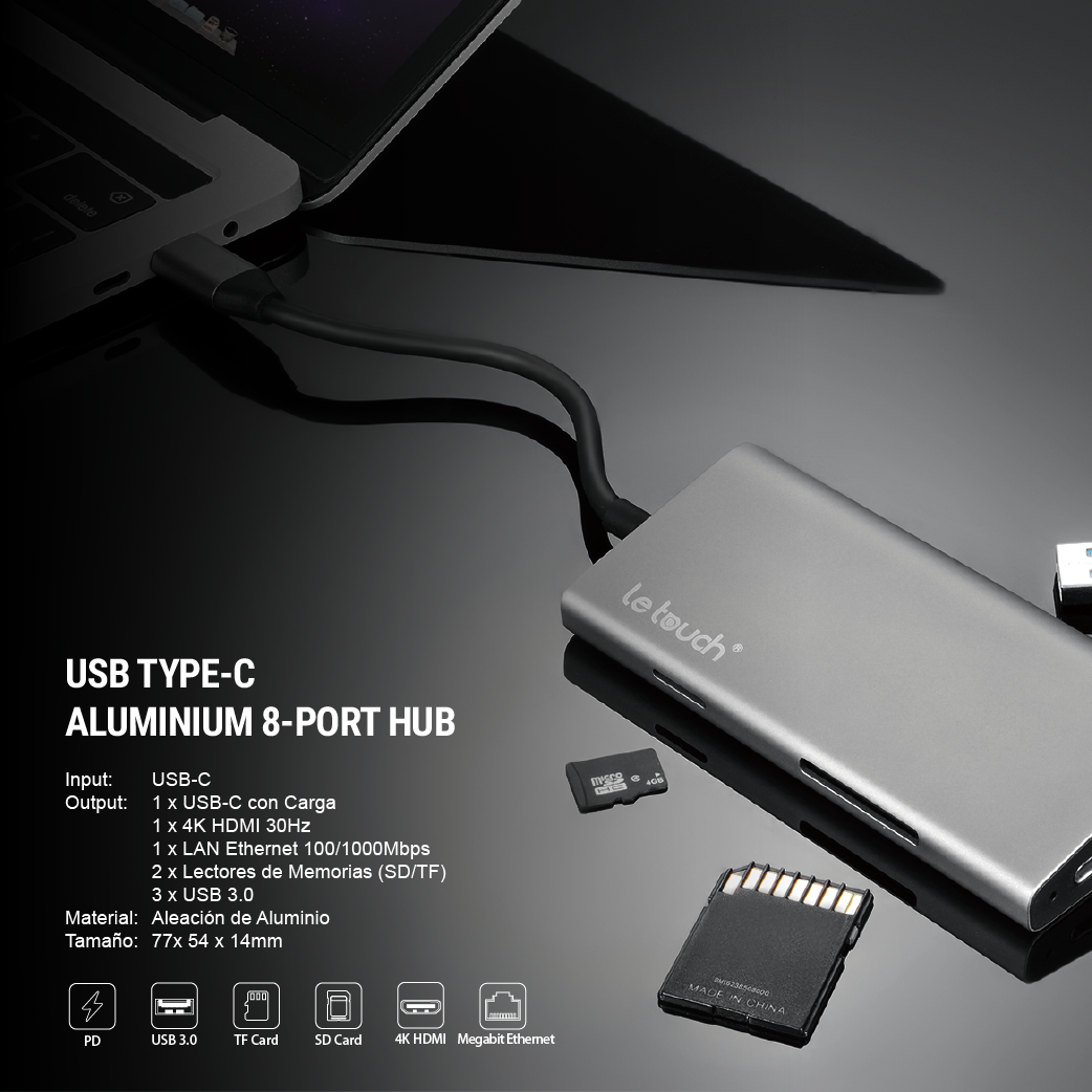 8 puertos (4K x 1, USB 3.0 x 3, USB-C x 1, Ethernet x 1, Lector de Tarjetas x 2)